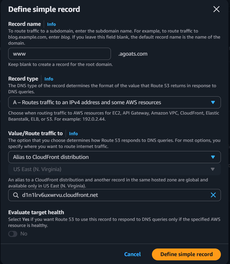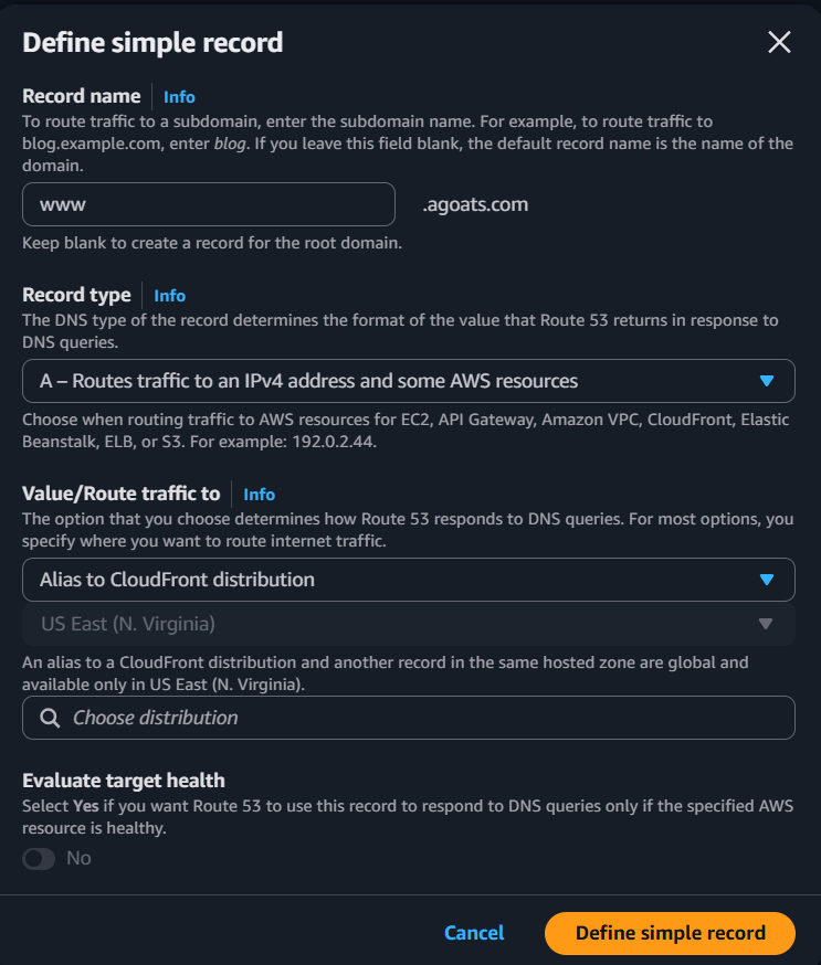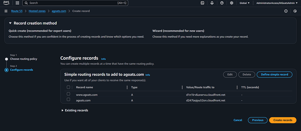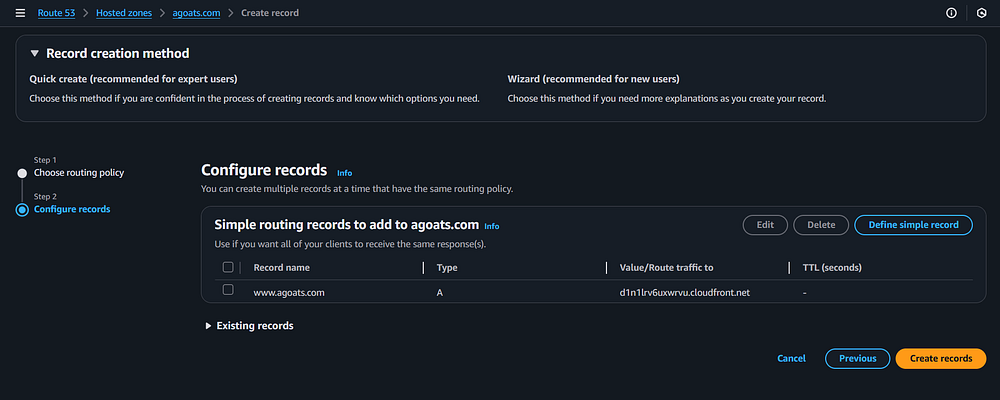 specific CloudFront distribution. Click the "Create records" button.