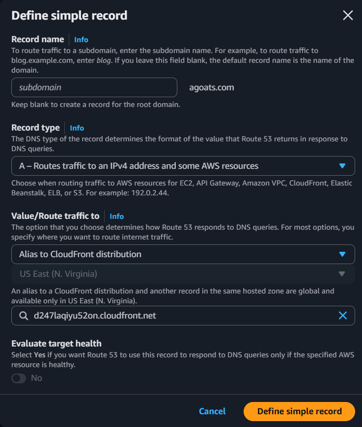 domain. This will allow customers who type in a root domain address to be routed via CloudFront to the root