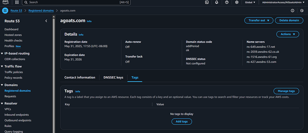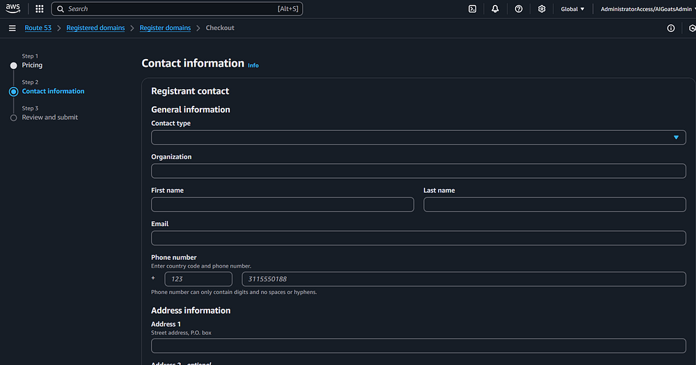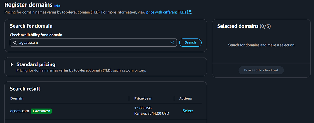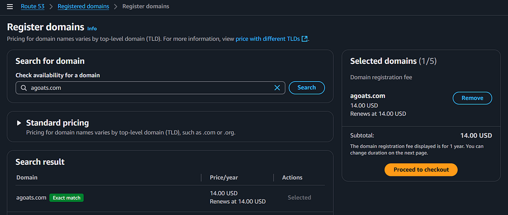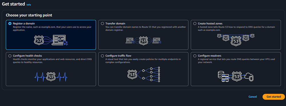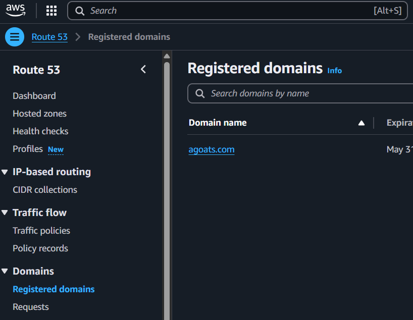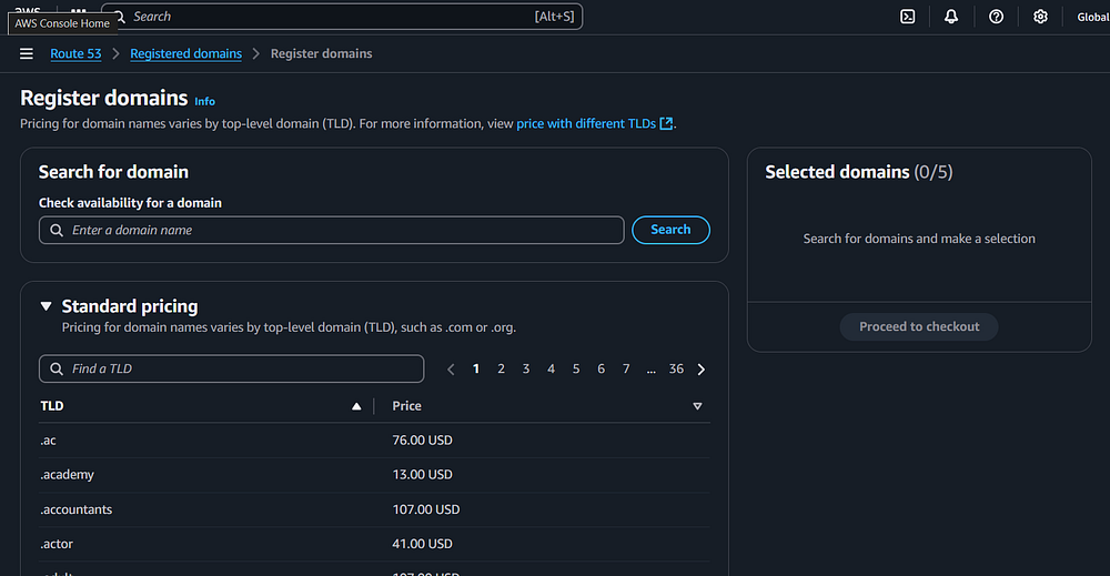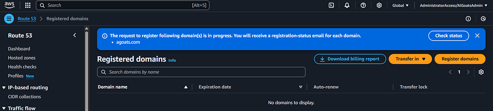 Step 12: In the AWS Console, you need to navigate to Route 53 to register a domain name for the