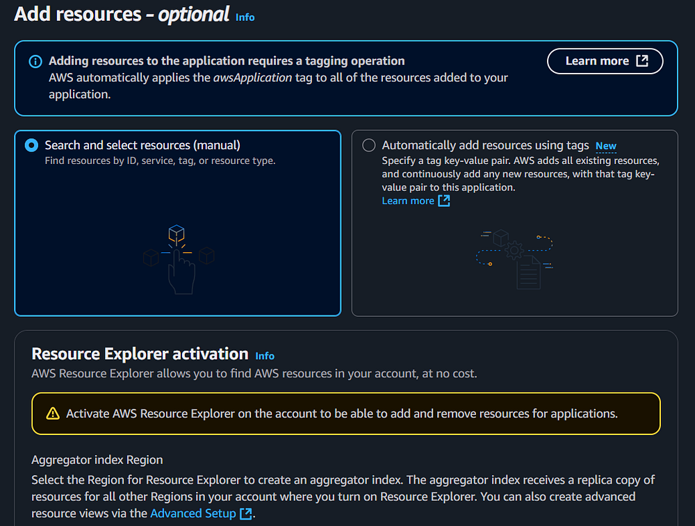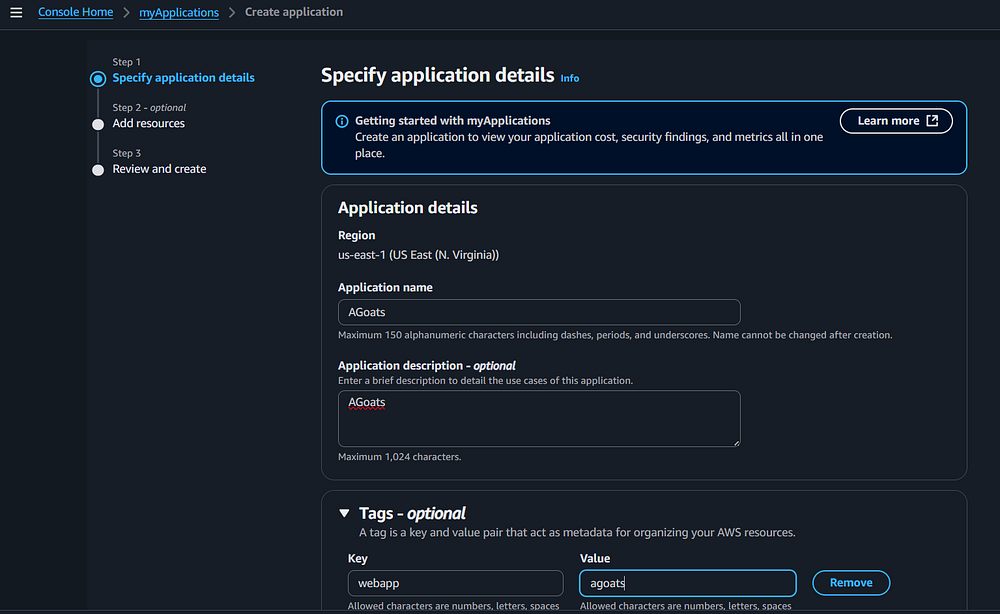 anything in the "Tags" section at this time, when you create the application, a Tag Key/Value pair will be