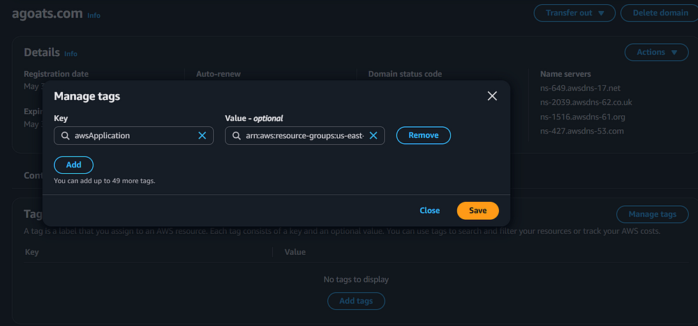 you are on this page, you can navigate to the "Hosted zone tags" tab and add the Tags to tie the hosted zone