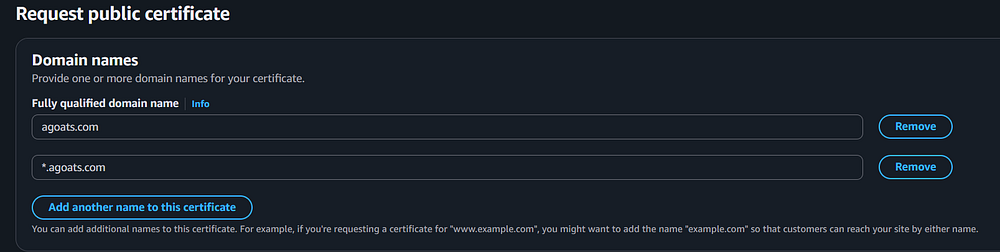 (CNAME) - optional" section and type in your Root Domain. In the case of the author, it is "agoats.com." You