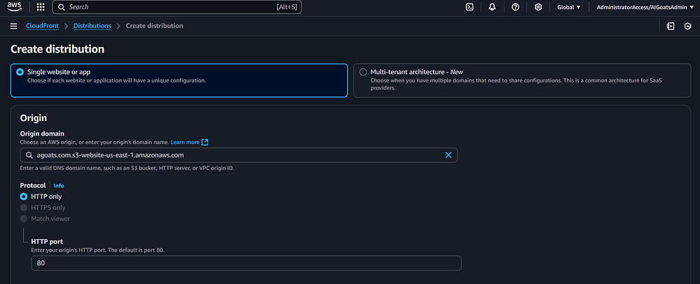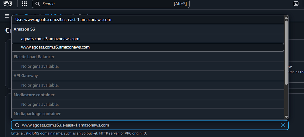 Step 82: In the "Origin Domain" section, you need to add the S3 Bucket Website Endpoint. Recall that,