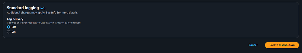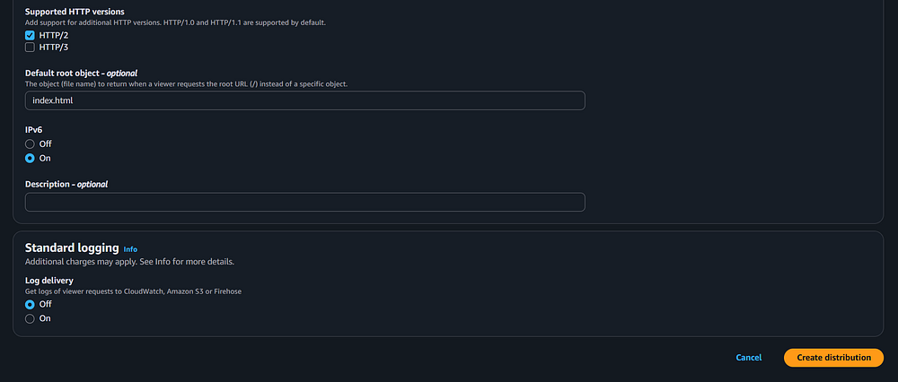 Step 71: Leave the remaining fields as default and click the "Create distribution" button. Note that