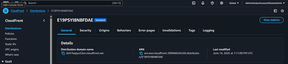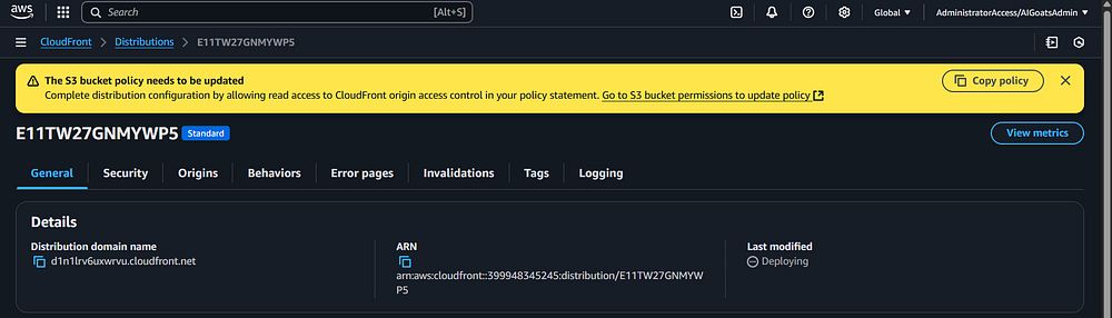 Step 79: In the CloudFront screen, go back to the "General" tab. You should see an option called