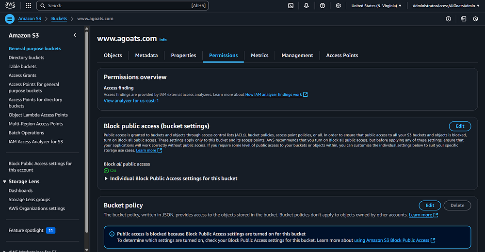 notice a highlighted link that says "Go to S3 bucket permissions to update the policy." Click that link.