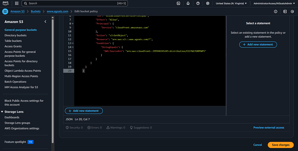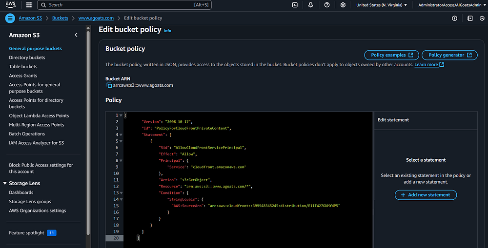 Step 74: A new tab should open in your browser, and you should be taken to the bucket policy screen.