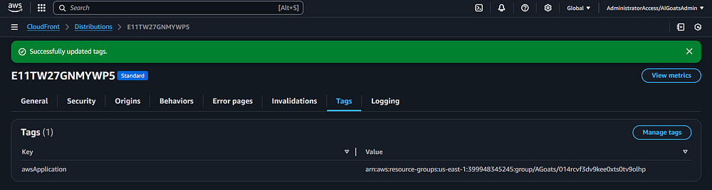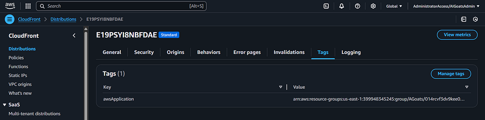 Step 78: Going back to the CloudFront screen, click on the "Tags" tab. As with previous services you