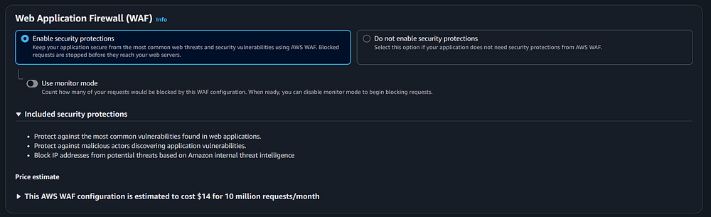 protections." Note that enabling WAF has a cost, you should see a price estimate area appear if you choose