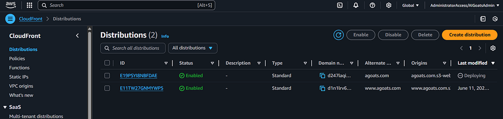 Step 88: If you go back to the main CloudFront screen, you should see both distributions. Note that