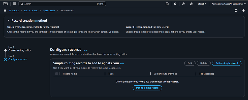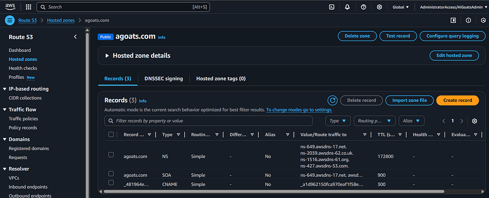 Step 94: You should see several records which AWS created be default. You will need to create new