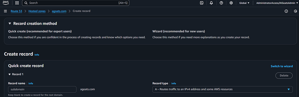 already shown. As with the prior step, ensure the "Record type" field is "A ‐ Routes traffic to an IPv4