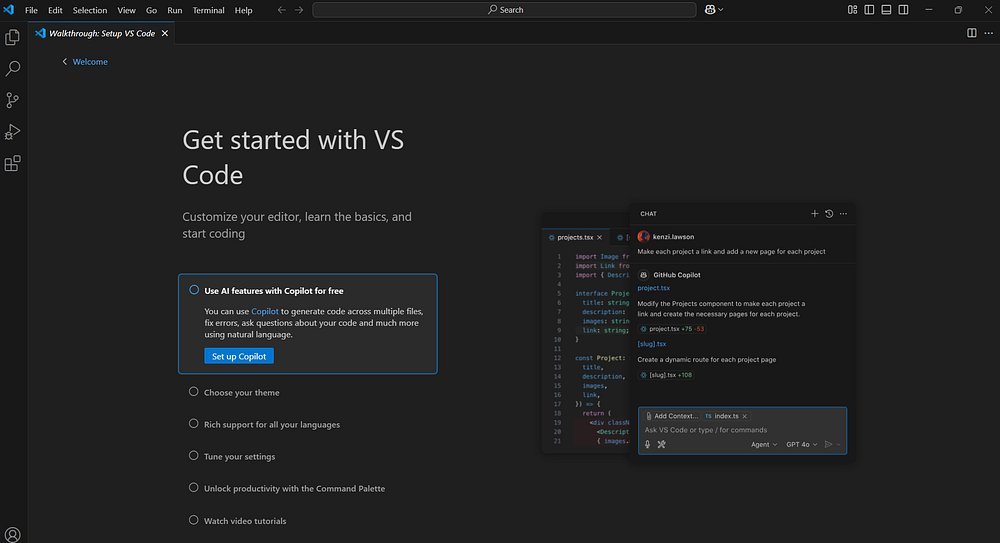 — Install Visual Studio Code), you should be on the Visual Studio Code "getting started" screen.