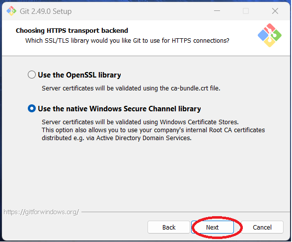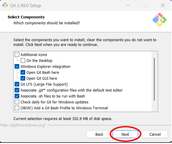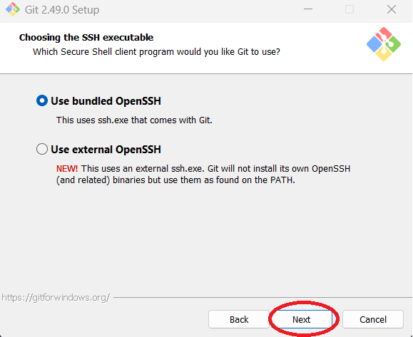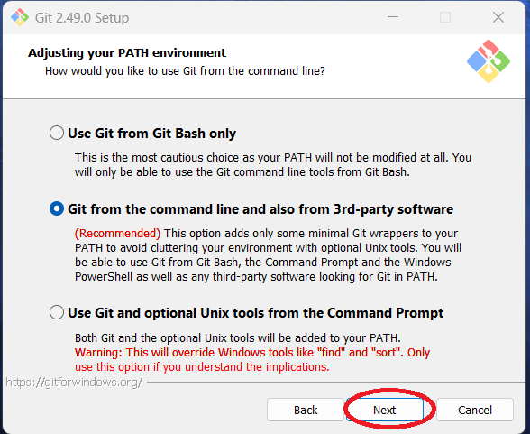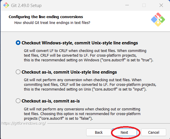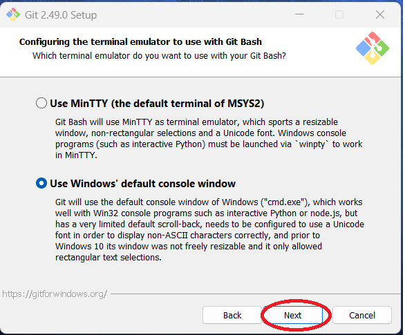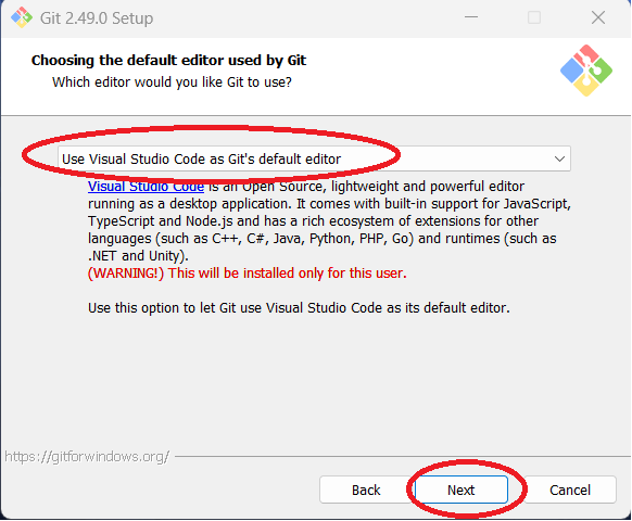 option in the dropdown menu) as Git's editor, the author has chosen to use Visual Studio Code. Click "Next"