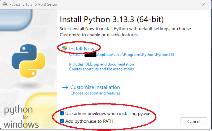 Check both boxes and then click the "Install Now" option unless you want to install Python in a custom