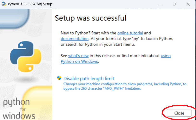 Python is now successfully installed.